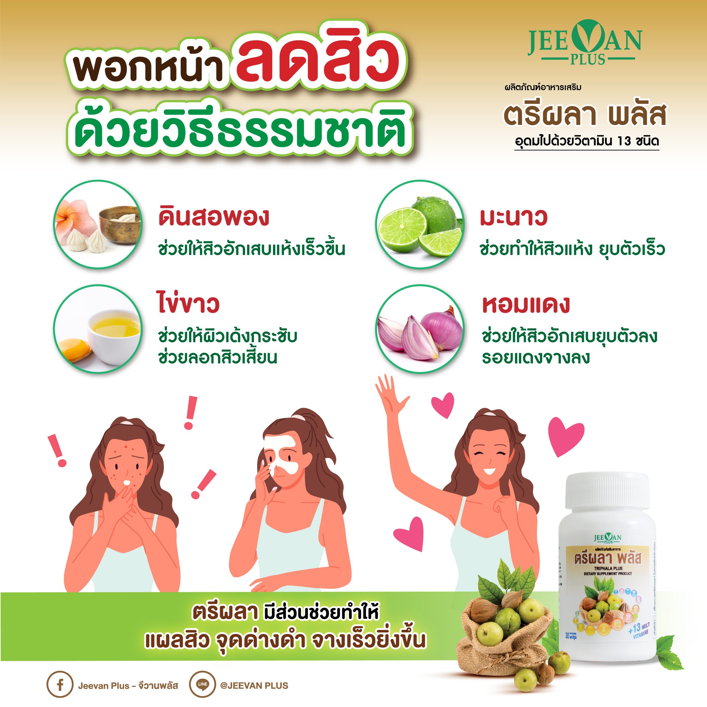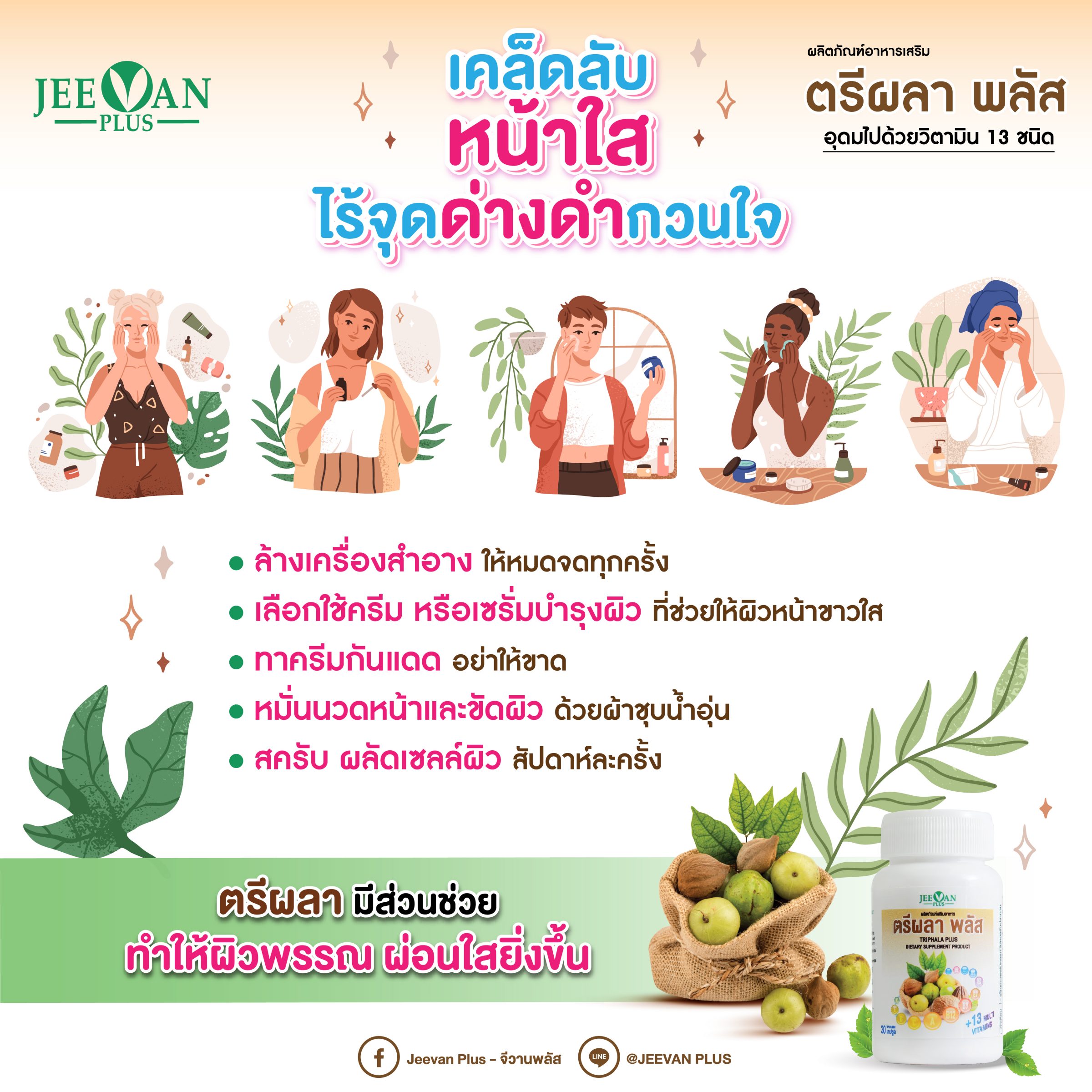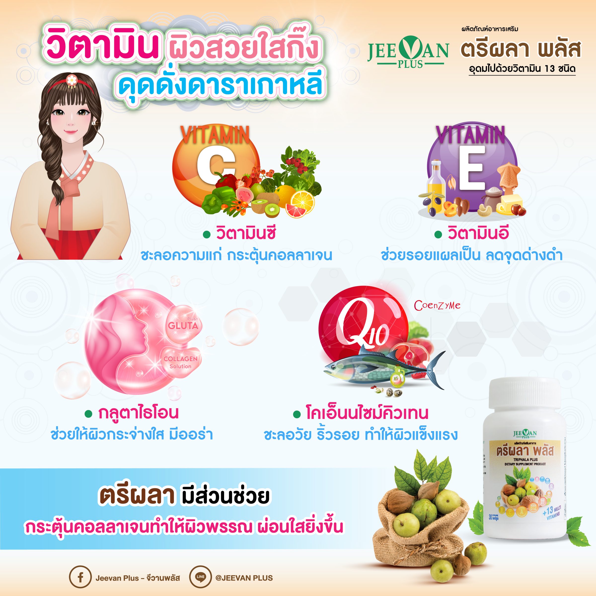 ตรีผลา เป็นอีกหนึ่งสมุนไพร ที่ช่วยเรื่องผิวสวย ซึ่งช่วยกระตุ้นคอลลาเจน ทำให้ผิวพรรณผ่องใส นอกจากนี้ยังช่วยเรื่องแผลสิว จุดด่าดำ ให้จางหายเร็วยิ่งขึ้น
